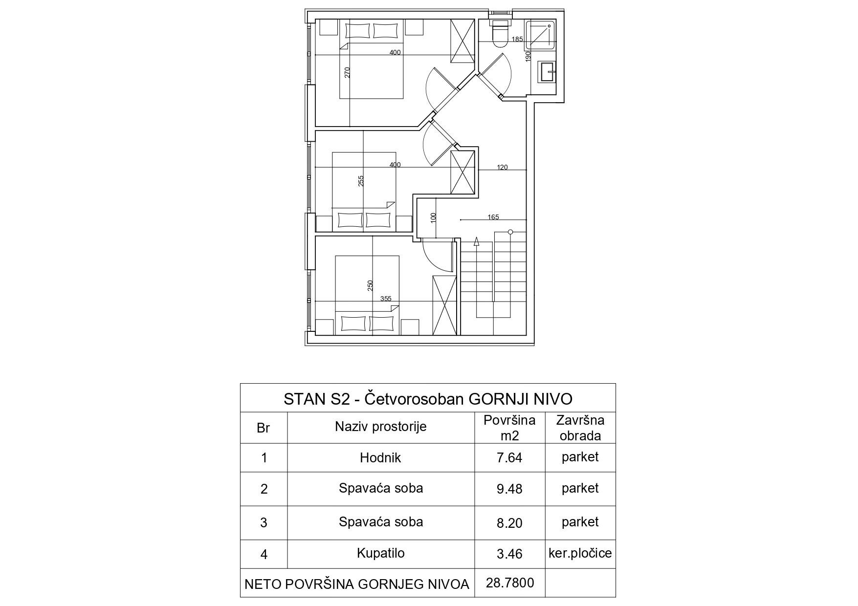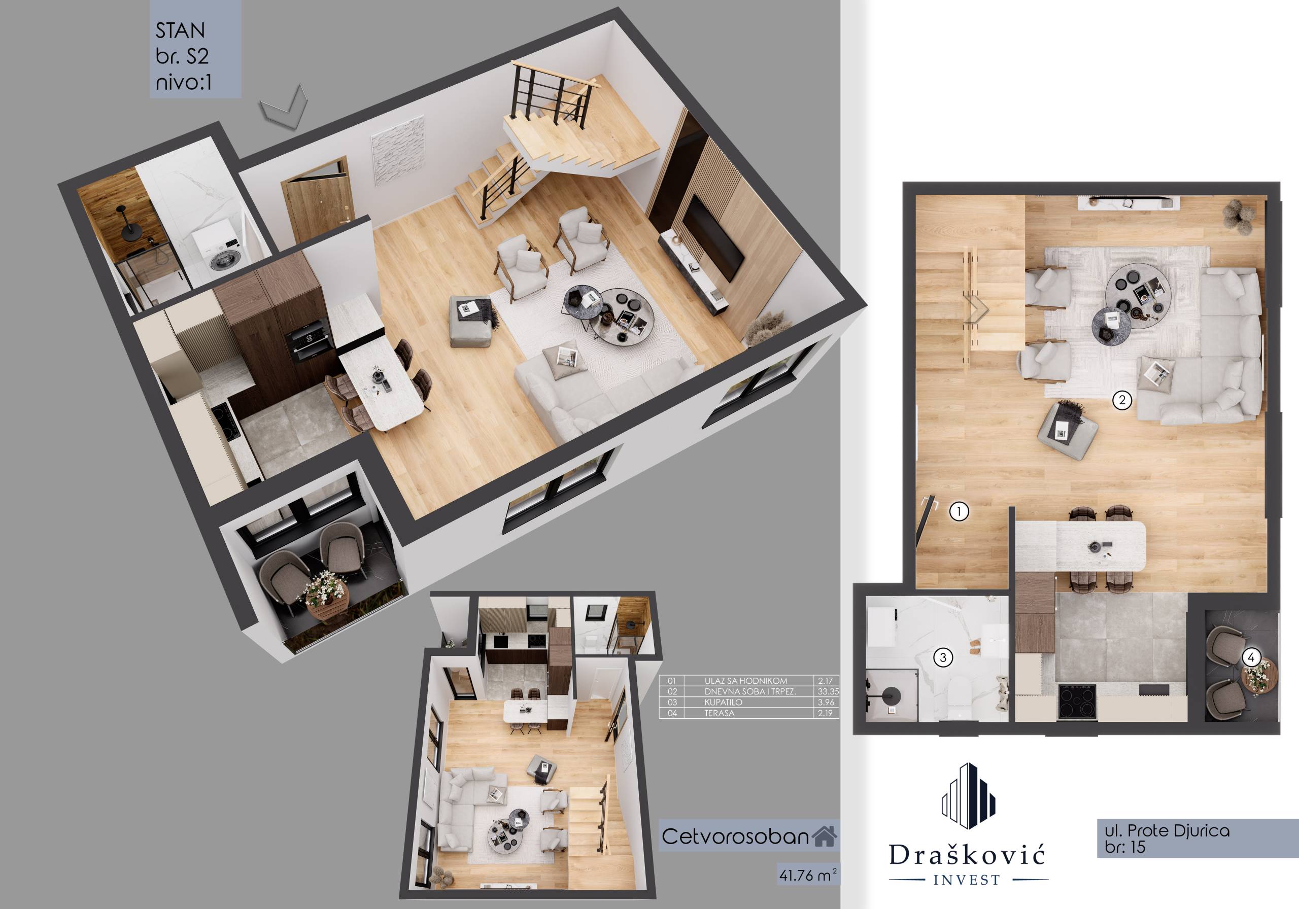 Fasada: Hodnik: Dizajn Kupatila: ZA LISTU MATERIJALA KLIKNITE OVDE Za objekat u Prote Đurića 15 je izdata pravosnažna građevinska dozvola, pocetak gradjevinskih radova se očekuje pocetkom aprila 2025 godine. Stanovi: Dostupan Rezervisan Prodat Dostupan Rezervisan Prodat STAN S1-PR i Sprat (Dupleks) 50.86m2 tj 62.03m2 Dvoiposoban Nacrt stana S1 donji i gornji nivo sa kotama: Nacrt stana S1 donji i gornji nivo sa kotama: STAN S2-PR i Sprat (Dupleks) 70.45m2 tj 78.89m2 Četvorosoban Nacrt stana S2 donji i gornji nivo sa kotama: Nacrt stana S2 donji i gornji nivo sa kotama: STAN S3-1.Sprat (visina drugog sprata) STAN S5-2.Sprat (visina trećeg sprata) STAN T1-PK 41.70m2 Dvosoban Nacrt stana S3 i S5 sa kotama: Nacrt stana S4 (45.38m2) sa kotama: STAN S4-1.Sprat (visina drugog sprata) STAN S6-2.Sprat (visina trećeg sprata) STAN T2-PK 40.75m2 Dvosoban Nacrt stana S4 i S6 sa kotama: Nacrt stana S4,S6 sa kotama: *Renderi izgleda stana su informativnog karaktera* Izdvajamo nesto od lokalnih sadrzaja: