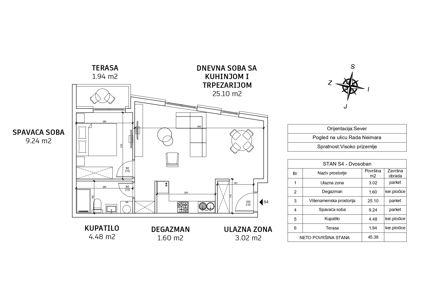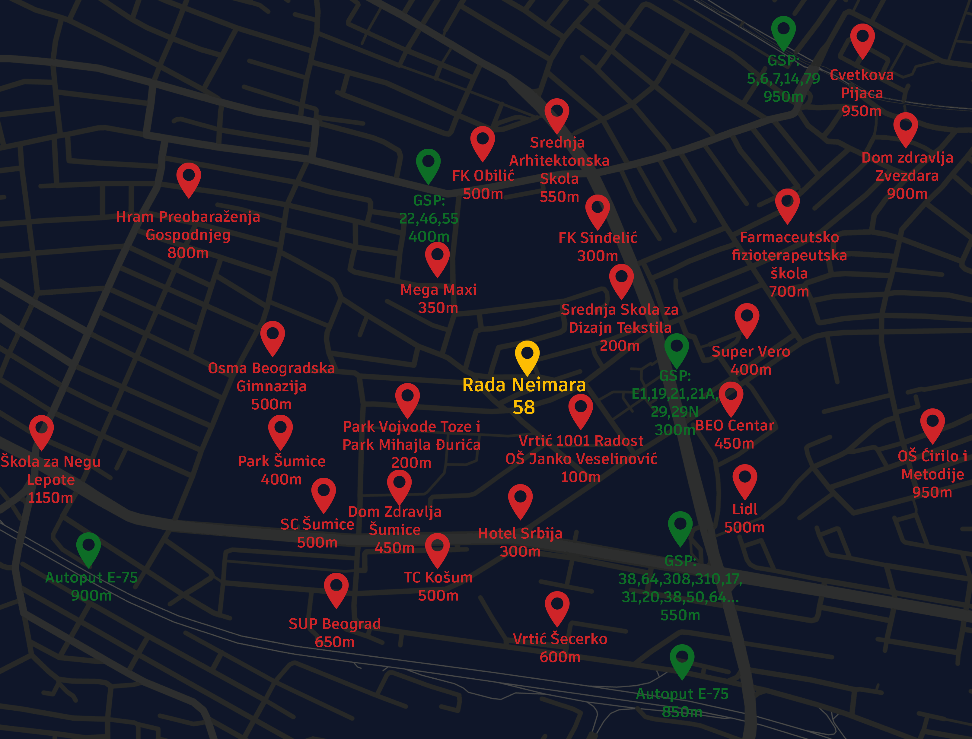 Svi stanovi su prodati. Za objekat je dobijena pravosnažna upotrebna dozvola. Hvala na poverenju! -> Uživo slike toka gradnje objekta <- -> Uživo slike završenog objekta <- Fasada: Hodnik: Render potencijalnog dizajna dnevne sobe: Render dizajna kupatila: ZA LISTU MATERIJALA KLIKNITE OVDE Dostupan Rezervisan Prodat Dostupan Rezervisan Prodat STAN S1-VPR 28.34m2 Jednosoban Nacrt stana S1 bez terase i sa terasom (28.34m2) sa kotama: STAN S3-VPR STAN S8-1. sprat STAN S13-2. sprat 44.76m2 Dvosoban Nacrt stana S3,S8,S13 (44.76m2) sa kotama: STAN S4-VPR 45.38m2 Dvosoban Nacrt stana S4 (45.38m2) sa kotama: STAN S5-1. sprat STAN S10-2. sprat STAN S15-Pk 28.26m2 Jednosoban Nacrt stana S5,S10,S15 (28.26m2) sa kotama: STAN S6-1. sprat STAN S11-2. sprat STAN S16-Pk 28.33m2 Jednosoban Nacrt stana S6,S11,S16 (28.33m2) sa kotama: Varijanta br. 1 za stan S7 i S12: STAN S7-1. sprat STAN S12-2. sprat 45.39m2 Dvosoban Varijanta br. 2 za stan S7 i S12: Nacrt stana S7,S12 (45.39m2) sa kotama: STAN S9-1. sprat STAN S14-2. sprat STAN S19-Pk 51.55m2 Dvosoban Nacrt stana S9,S14,S19 (51.55m2) sa kotama: *Renderi izgleda stana su informativnog karaktera* Izdvajamo nesto od lokalnih sadrzaja: